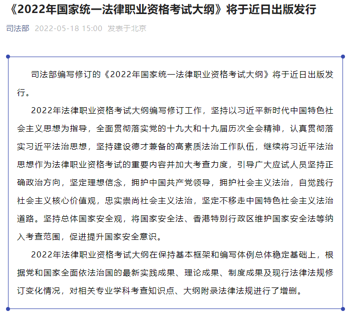 就在刚刚!司法部官宣!《2022年国家统一法律职业资格考试大纲》将于近日出版发行!