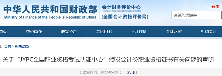 财政部打假“JYPC全国职业资格考试认证中心颁布的会计类证书”。
