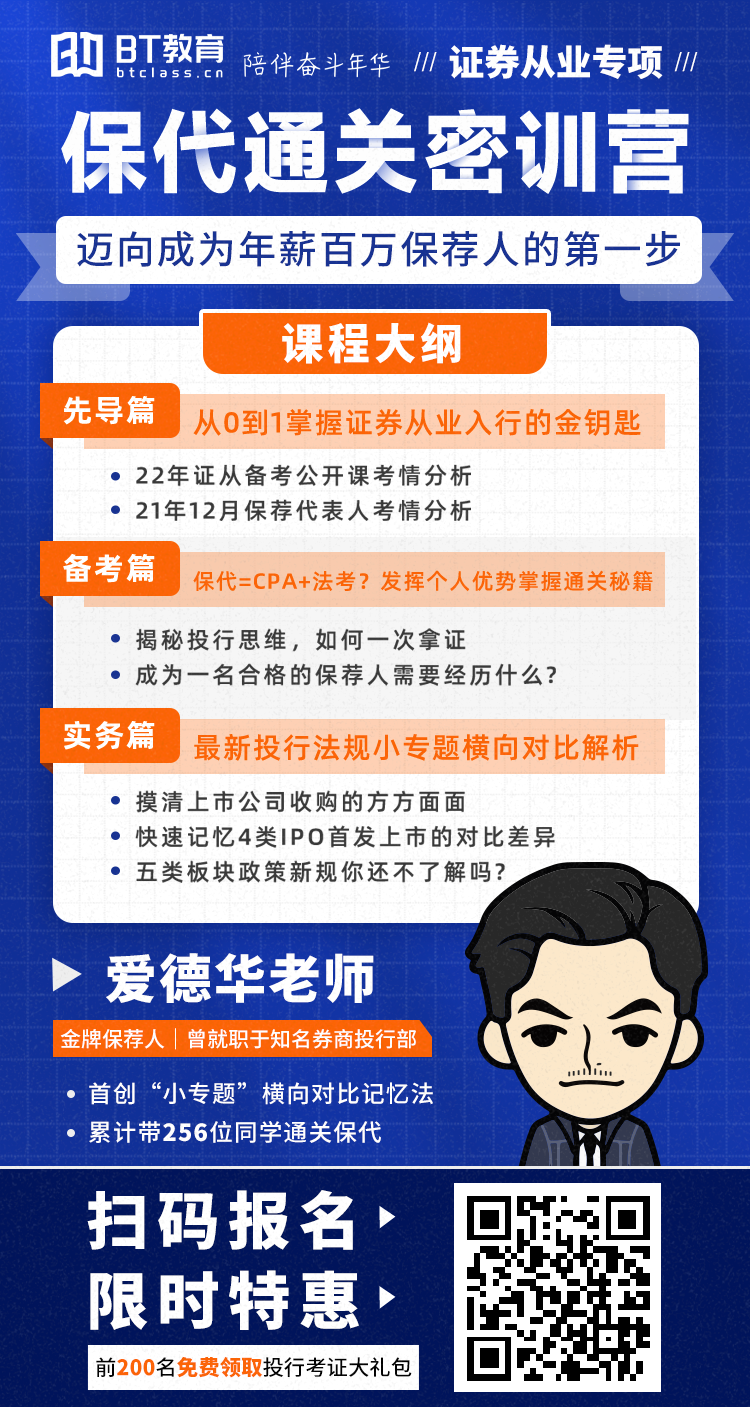 这是BT教育的明星老师,保荐人爱德华老师带领教研团队一起打造的,专门针对22年保代考生的备考方法训练营。已经帮助256名保代考生顺利通关,相信参加过这次训练营的同学今年也能取得不错的成绩。除了有10堂精品课程加3套精选电子教材 外,最后一天我们还邀请了BT人气名师亚瑟老师为我们直播答疑,帮你制定个性化职业规划,和迷茫焦虑说再见~