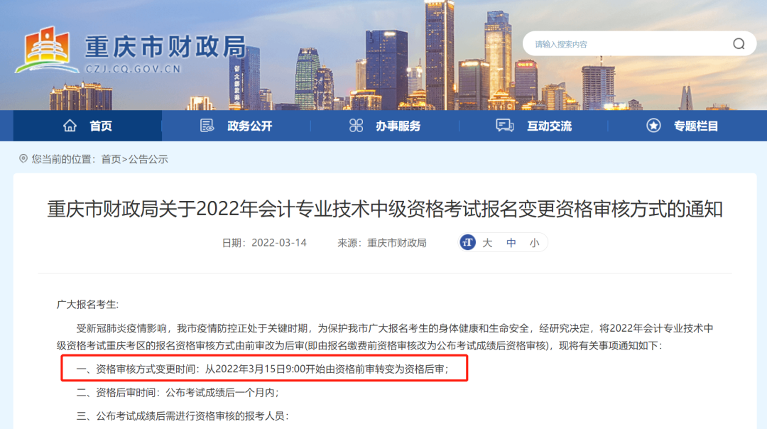 3月14日,重庆财政局突然发布《重庆市财政局关于2022年会计专业技术中级资格考试报名变更资格审核方式的通知》。