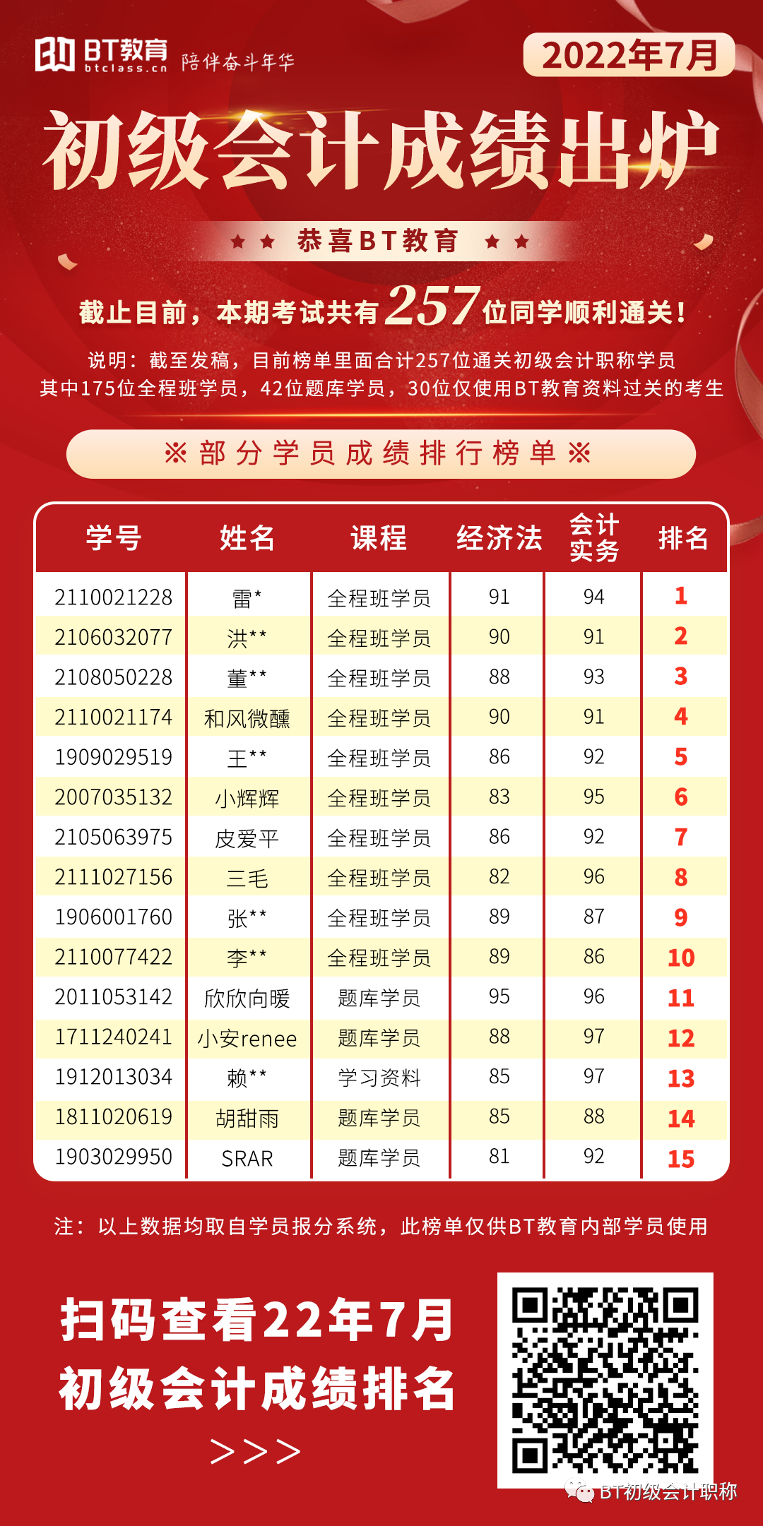 首先要恭喜我们初级考生257位同学顺利通关!
