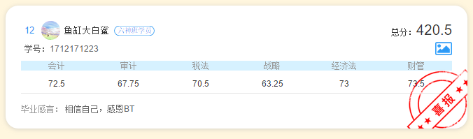 真心庆幸第一次正式备考就报名了 BT 学院的注册会计师培训六神班,真心感谢彬哥让我成为一次性过六门的学霸。