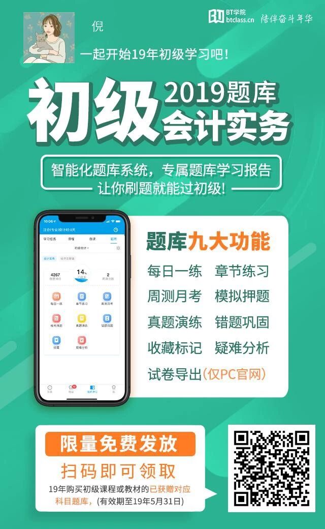 注:已经购买19年初级课程、教材、保过包的同学已经获赠最新版的题库,无需重新领取。
