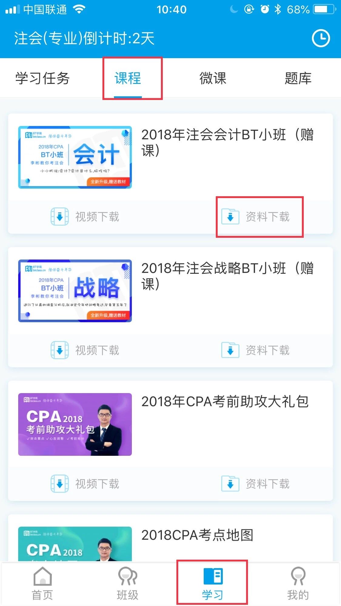 2.登录-选择【学习】-【课程】-点击封面进入听课-或点击【资料下载】