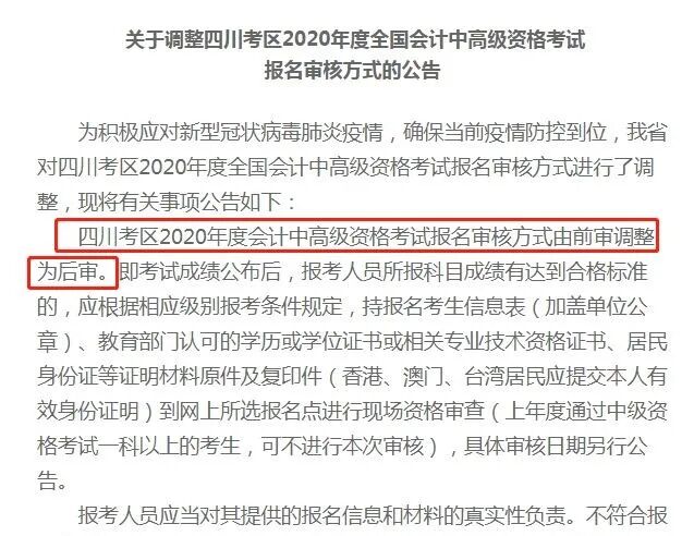 为积极应对新型冠状病毒肺炎疫情,确保当前疫情防控到位,我省对四川考区2020年度全国会计中高级资格考试报名审核方式进行了调整:资格考试报名审核方式由前审调整为后审~