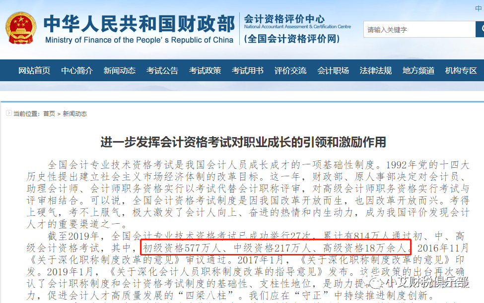 很显然,这个小目标早就完成了,在2019年底发布的《进一步发挥会计资格考试对职业成长的引领和激励作用》中,截至2019年,全国会计专业技术资格考试已成功举行27次,累计有814万人通过初、中、高级会计资格考试,其中,初级资格577万人、中级资格217万人、高级资格18万余人