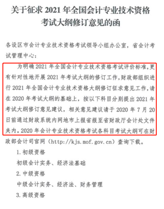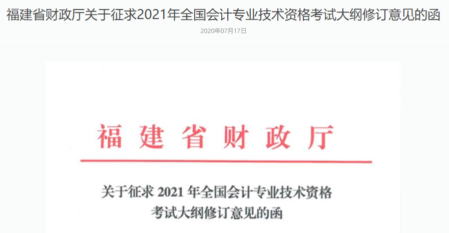 此前,吉林省、福建省财政厅发布了《关于征求2021年全国会计专业技术资格考试大纲修订意见的函》,其中表明:为明确2021年全国会计专业技术资格考试评价标准,更有针对性地开展2021年考试大纲修订工作,请在2020年考试大纲的基础上,按科目分别提出2021年考试大纲修订意见建议。